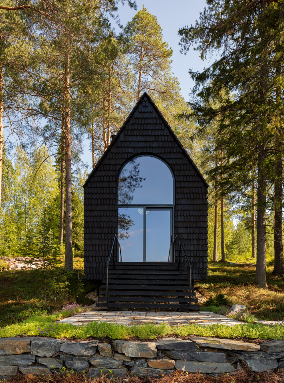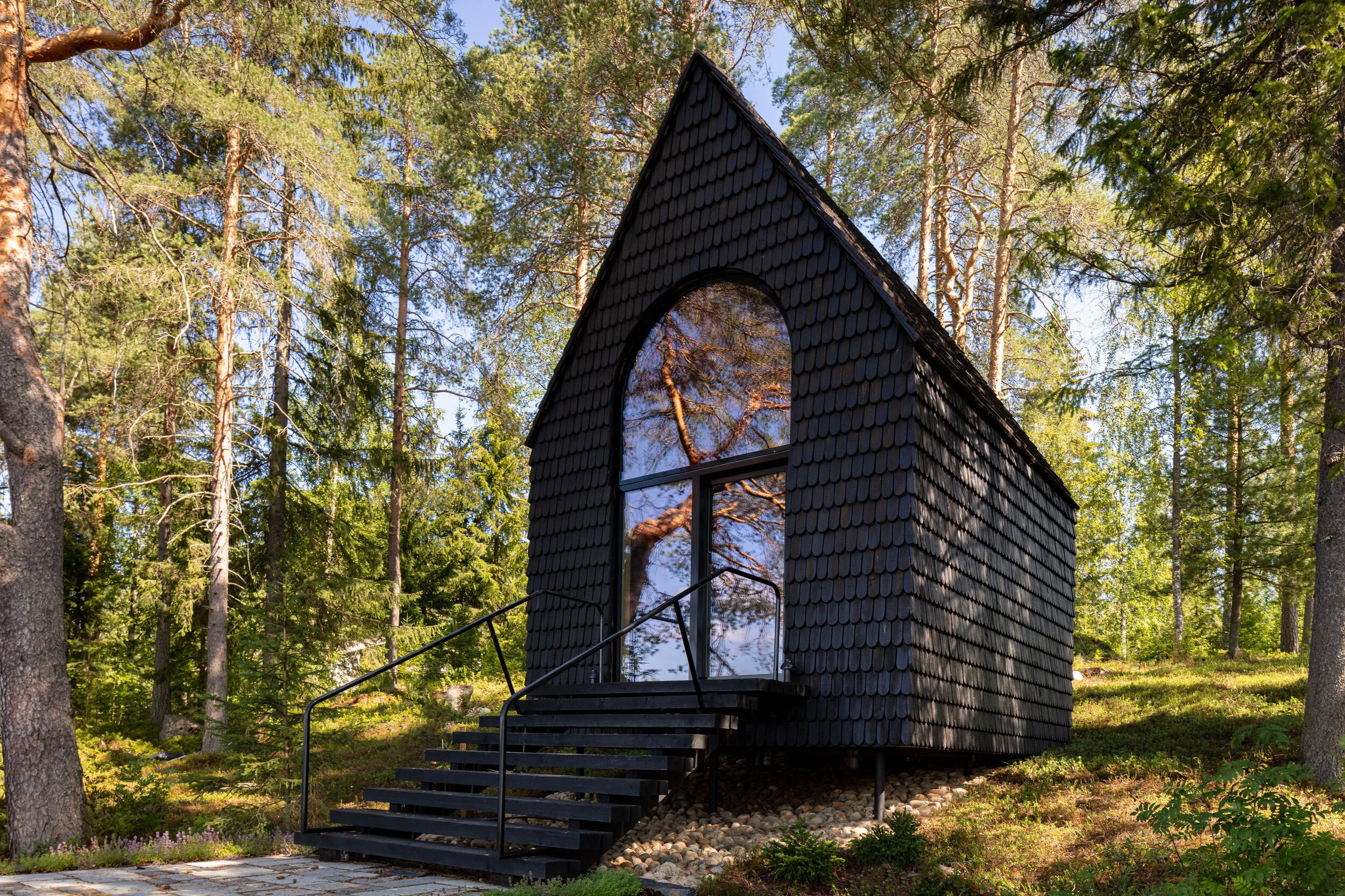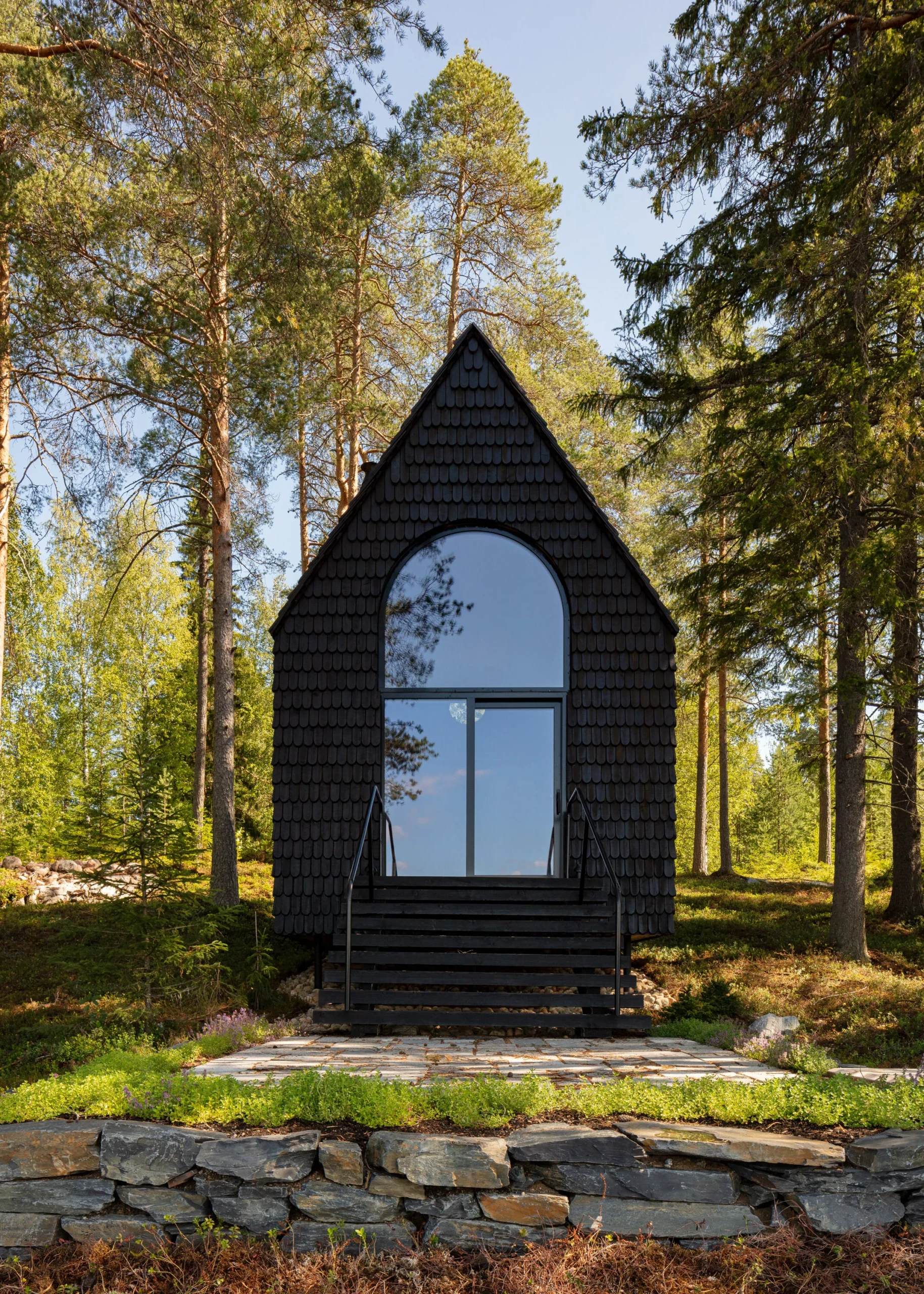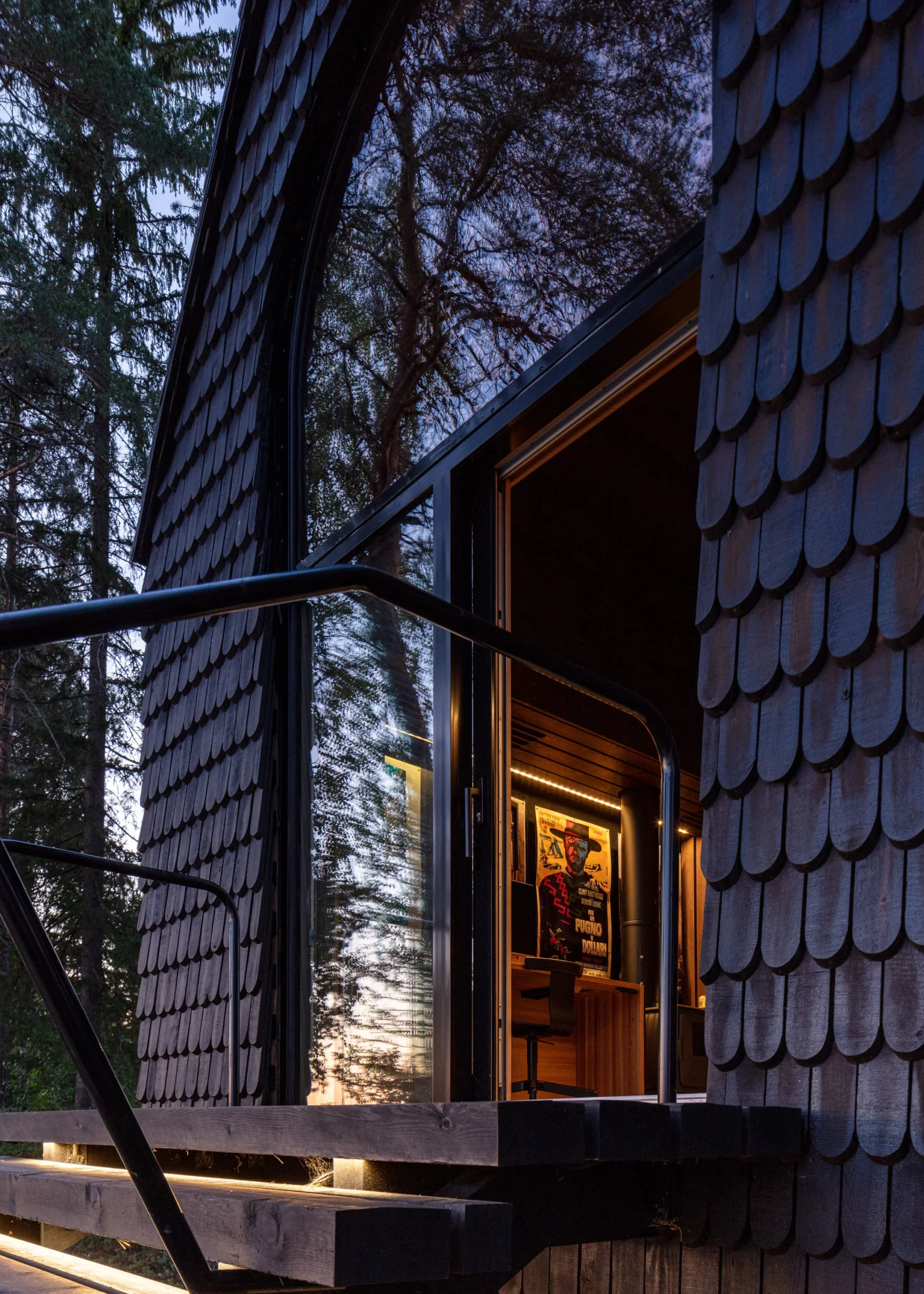 A workspace for our dear friend on the shore of a lake in Iisalmi central Finland. The hut takes a form of an old shingle clad wooden basilica church and mixes in influences from 80´s escapist cinema. The hut oozes mysticism with its multisensual baroque galore.