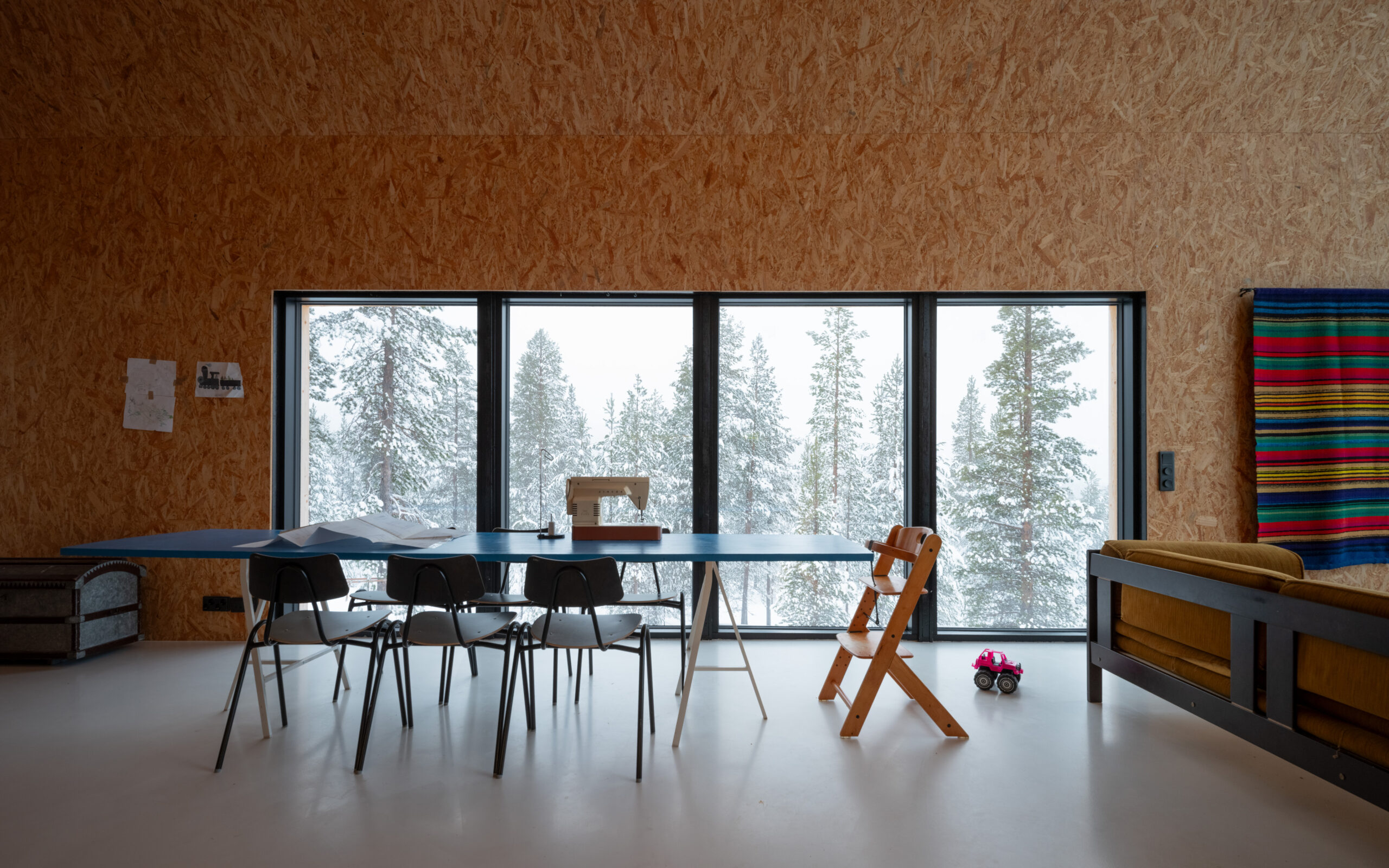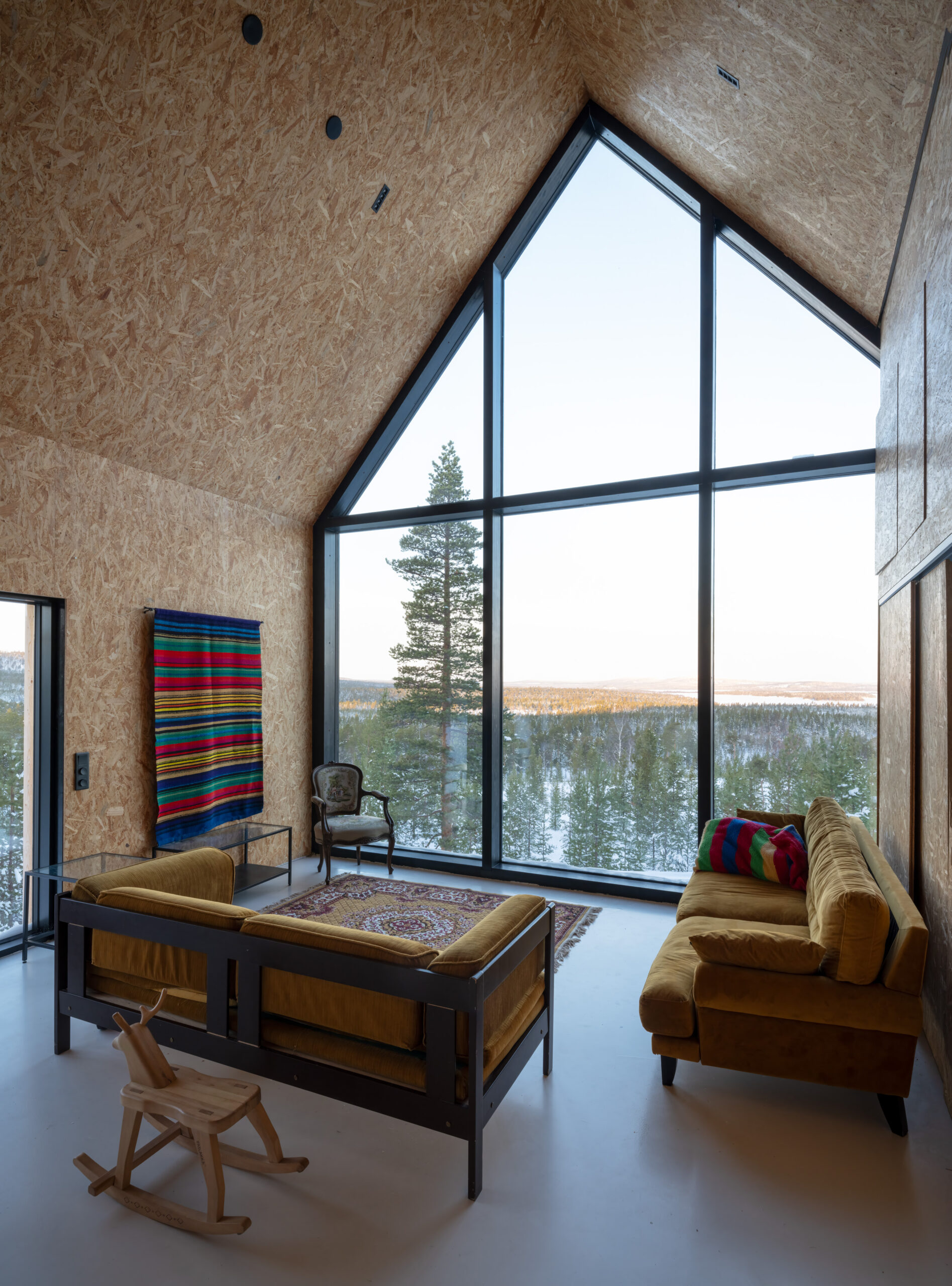 The design had two main goals: to fully embrace the magnificent view of Lake Inari in the north, and to be affordable. To keep costs down, I arranged all the essential spaces as tightly as possible around a double-height living area. With what was left of our bank loan, we managed to build 50 square meters of living space.