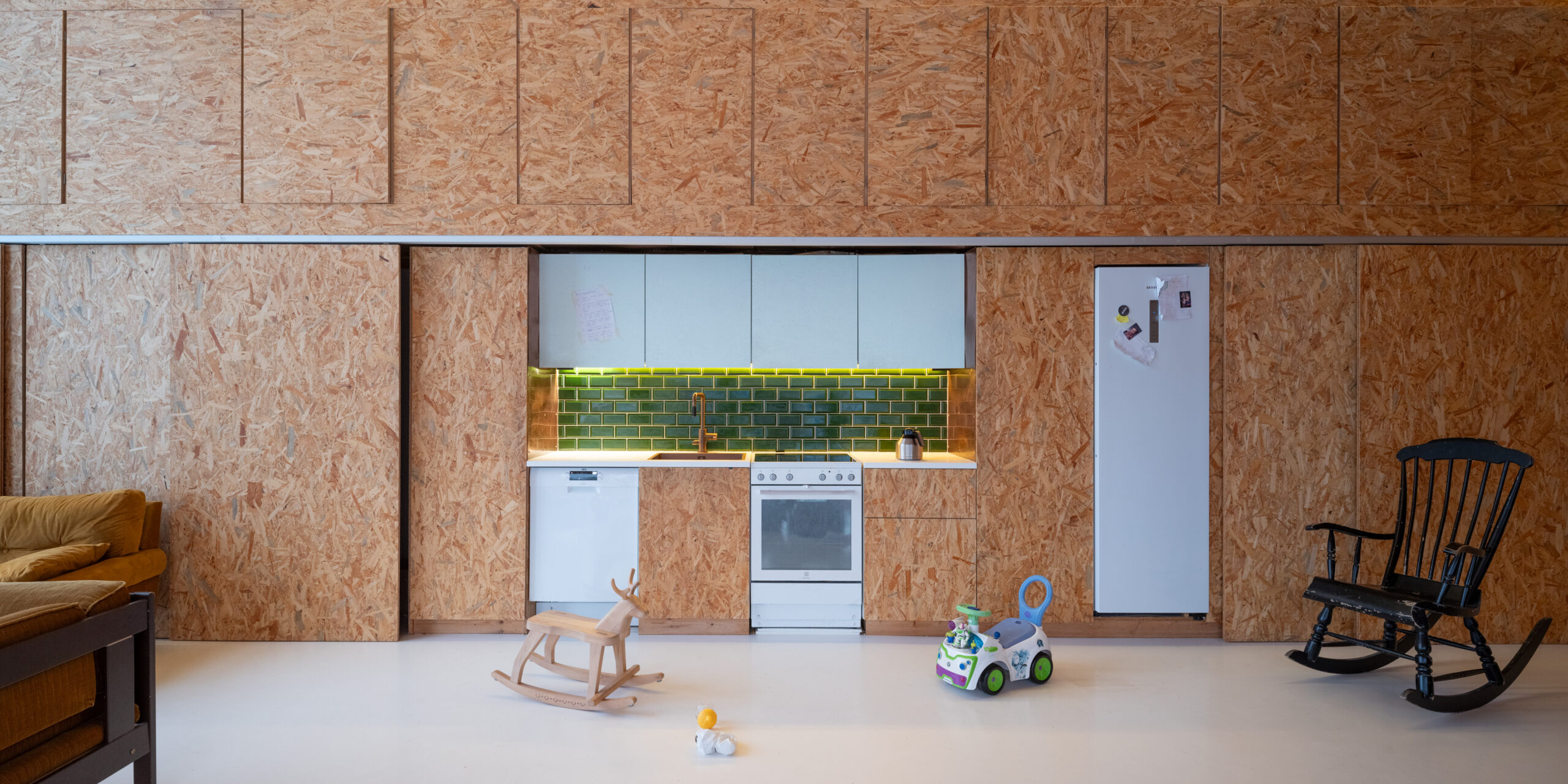 Spatially, the house is very straightforward. From the entrance, you can see the large red brick fireplace and, beyond it, the gable-end window. The bedrooms are located on the eastern side of the living area, with the master bedroom and en-suite tucked into the southern end. The doors to the kids’ rooms and my wife’s study (which also looks out over the lake) are cleverly hidden among the kitchen cabinets. The entire kitchen can be concealed behind sliding doors—perfect for when we’re too tired to tidy up.