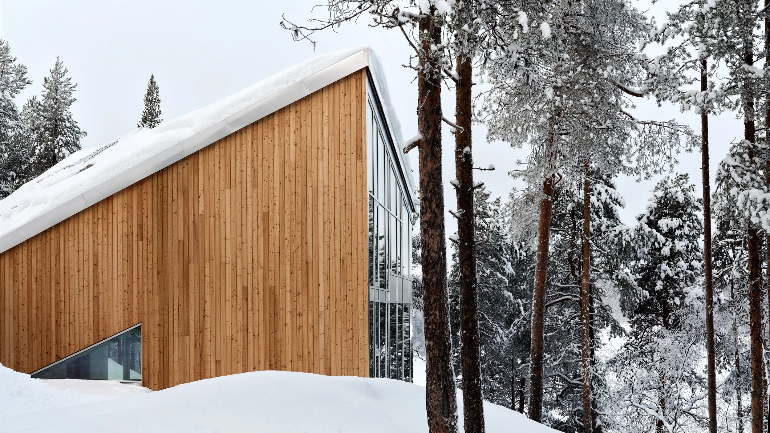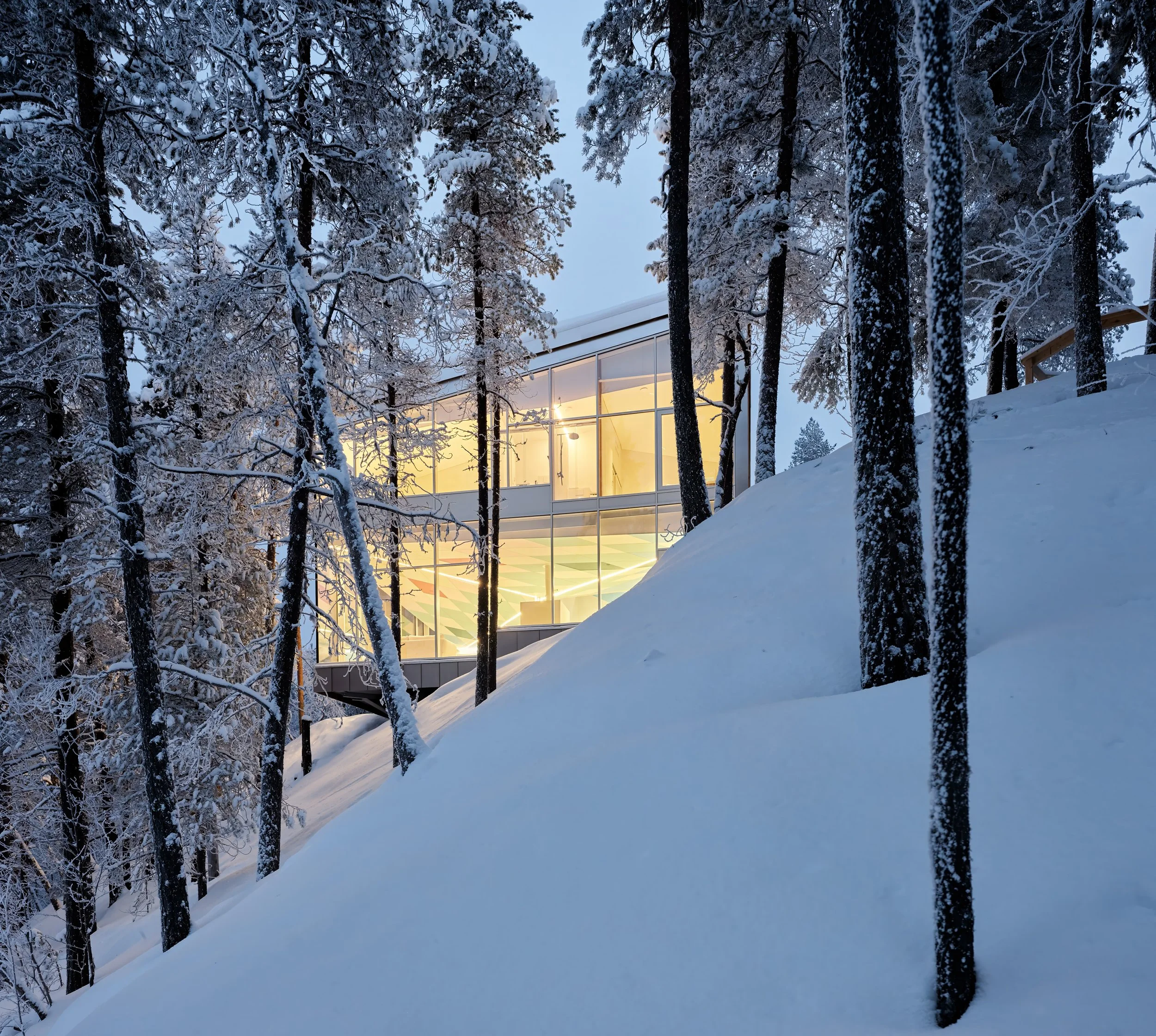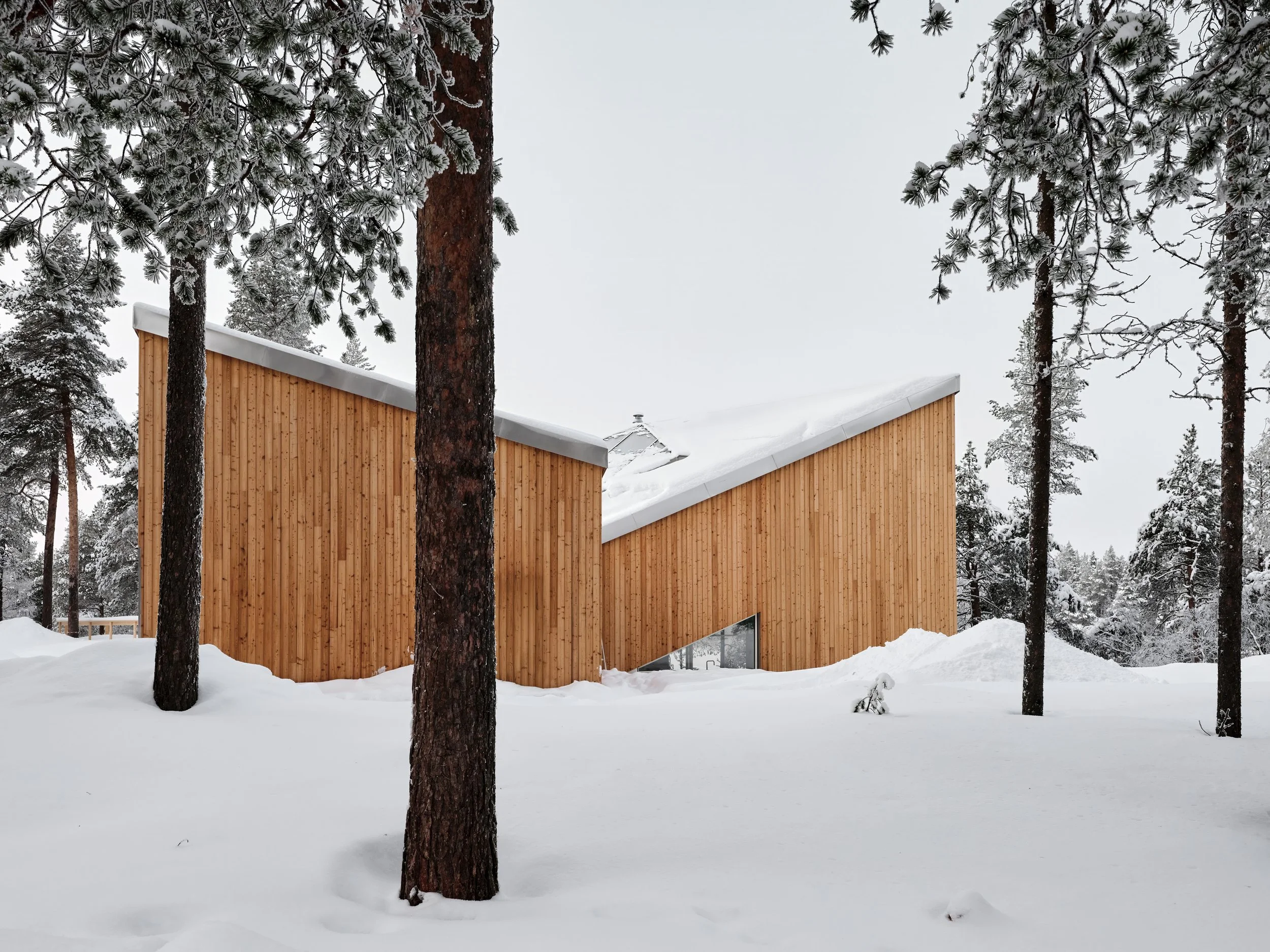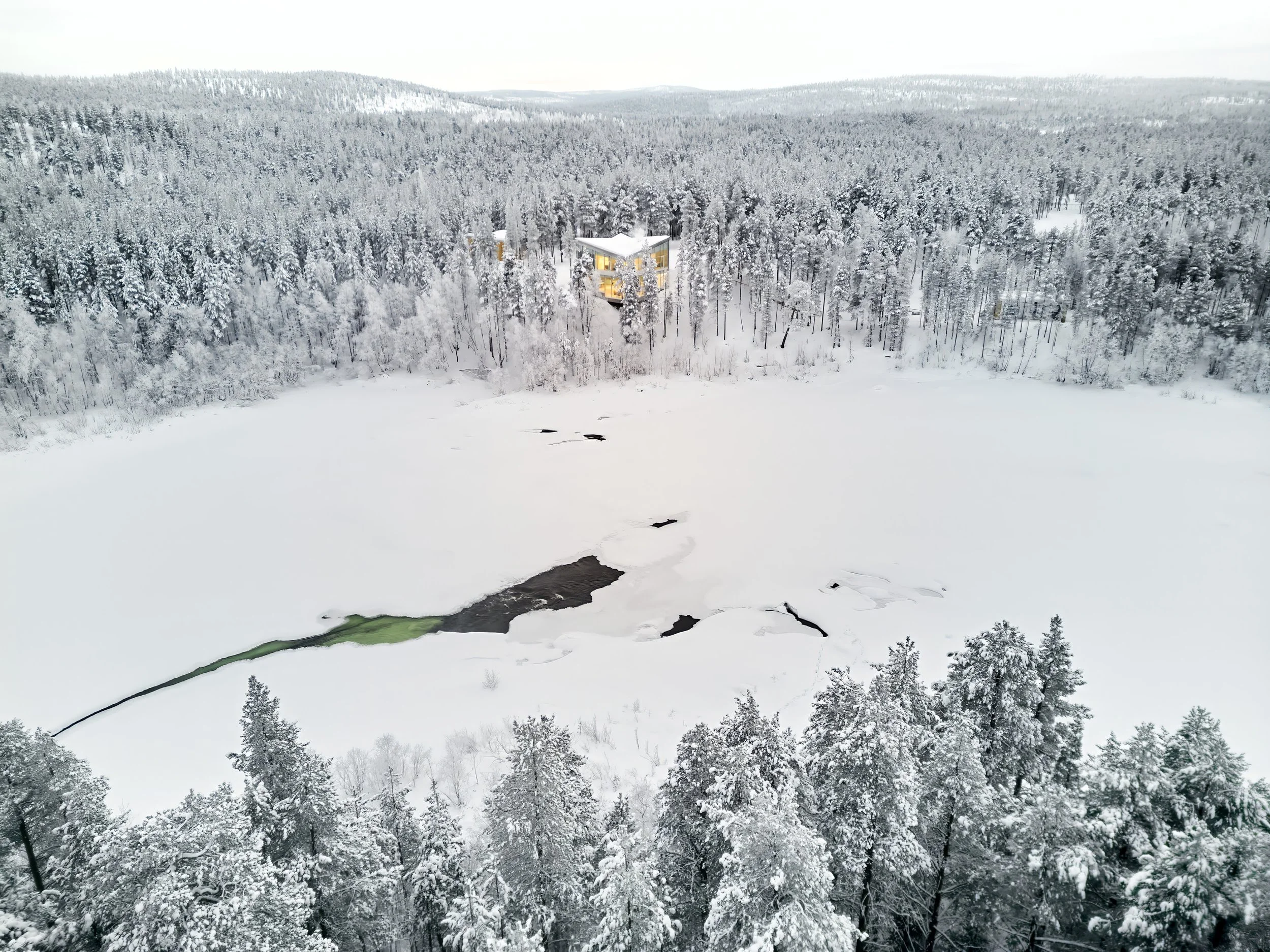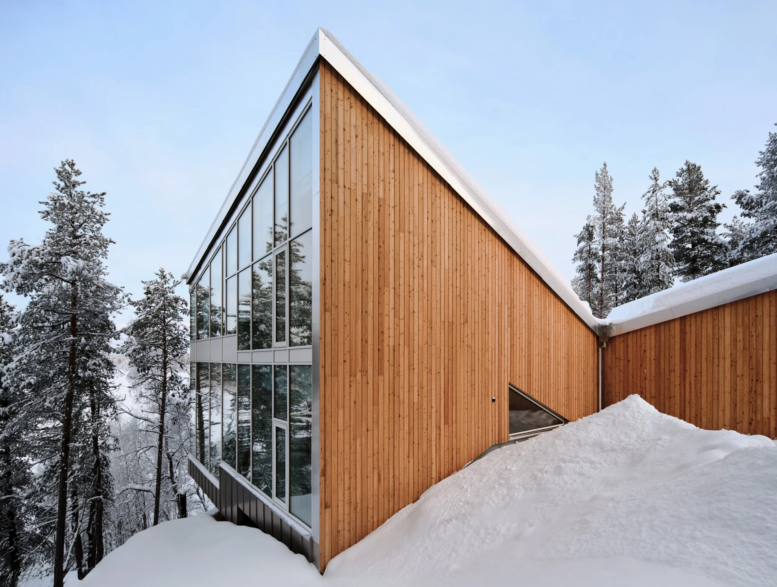 A private villa overlooking the bank of River Ivalo in Finnish Lapland. The villa integrates the landscape and surrounding nature into daily life. The nature-formed main space is carefully tuned to reflect the landscape beyond the glass walls. Combined with a colour scheme that creates visual connections to the surroundings, this design makes it possible to live as part of the landscape. The villa is situated on the bank of an L-bend of the Ivalo River, overlooking the rapids. Living spaces and bedrooms mirror the bend’s form, allowing for a 1.5 km parallel view to the northeast (sunrise) and a 1 km parallel view to the northwest (sunset) along the river, visible from both living and sleeping areas. Just beyond the river begins the vast Hammastunturi wilderness.
