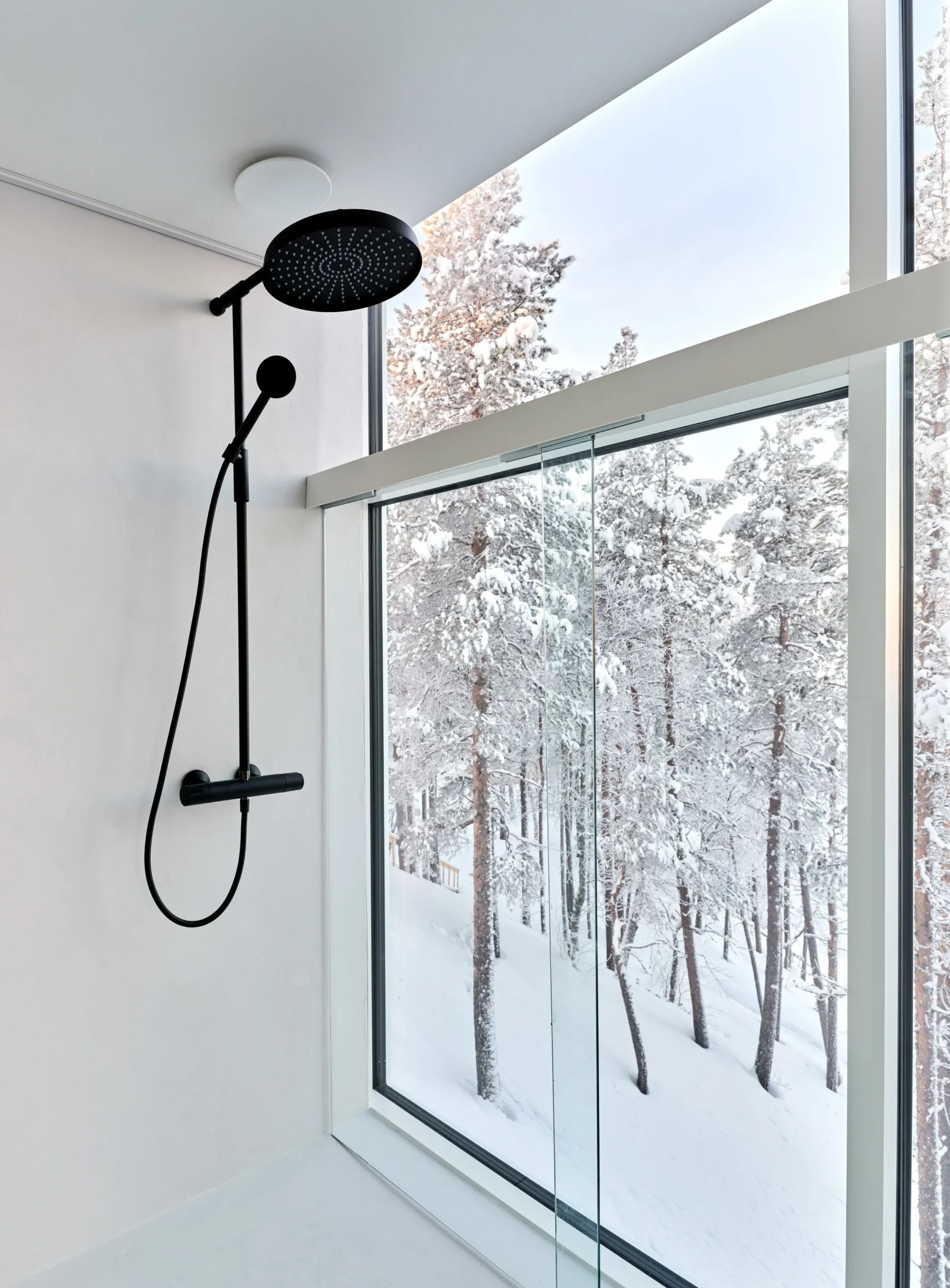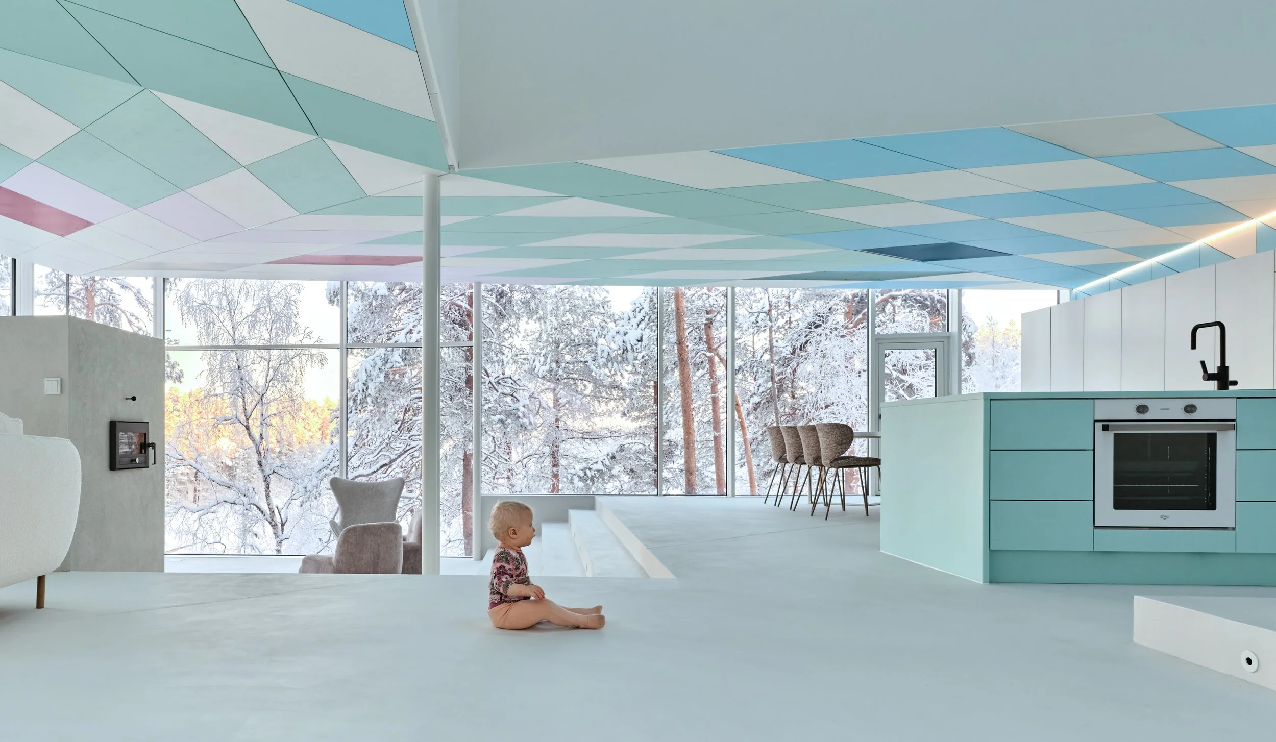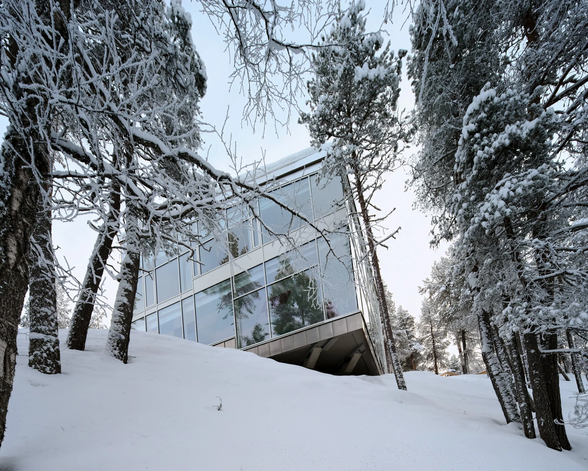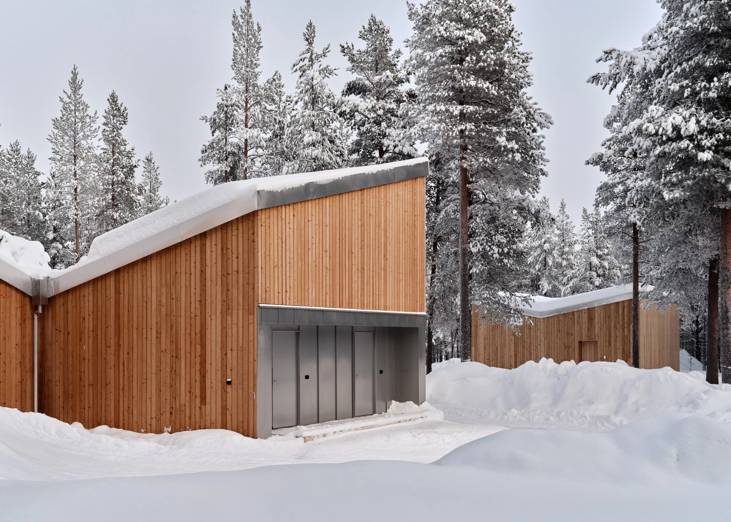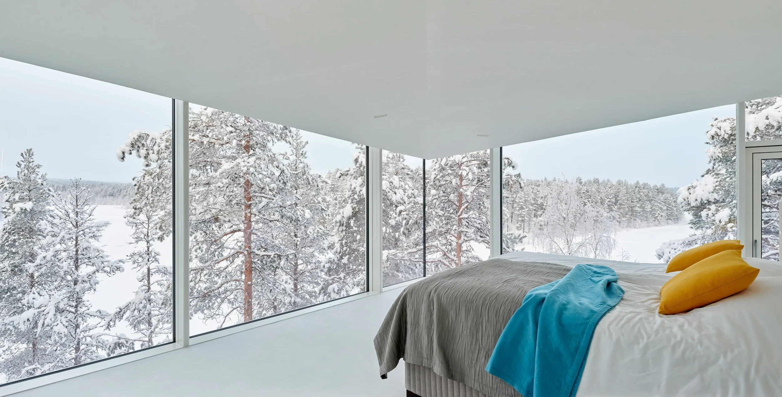 A private villa overlooking the bank of River Ivalo in Finnish Lapland. The villa integrates the landscape and surrounding nature into daily life. The nature-formed main space is carefully tuned to reflect the landscape beyond the glass walls. Combined with a colour scheme that creates visual connections to the surroundings, this design makes it possible to live as part of the landscape. The villa is situated on the bank of an L-bend of the Ivalo River, overlooking the rapids. Living spaces and bedrooms mirror the bend’s form, allowing for a 1.5 km parallel view to the northeast (sunrise) and a 1 km parallel view to the northwest (sunset) along the river, visible from both living and sleeping areas. Just beyond the river begins the vast Hammastunturi wilderness.